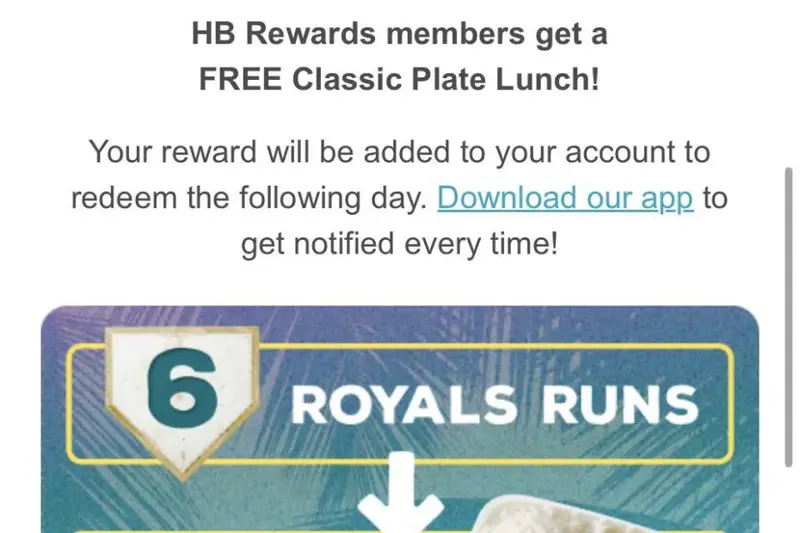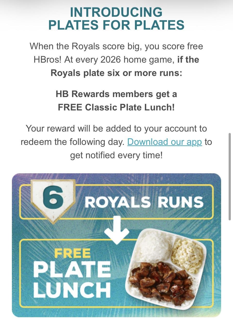 Hawaiian Bros Rewards members can score a FREE Classic Plate Lunch whenever the Kansas City Royals score 6 or more runs during a home game.